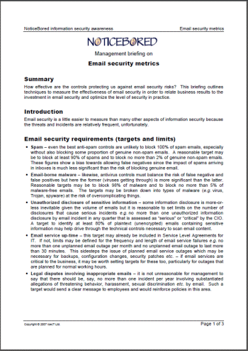 For each of those potentially interesting concerns, there may be several actual ways to generate the corresponding measures, and several ways to analyze, present and hopefully use the data. The paper outlines just a few examples to illustrate the approach, but it should be obvious from the above that we could easily have written a very long and boring treatise just on email security metrics. We didn't ... because the paper was 'just' written for awareness purposes: it is designed to get managers thinking and talking about security metrics, opening their eyes to the possibilities and encouraging them to consider their own, specific information needs as opposed to the few generic examples given. Rather than boring the pants off our readers, we're hoping to intrigue and stimulate them, catch their imagination not write a book on it. [By the way, that's one of the objectives for the security awareness program, implying that perhaps we might measure it in order to confirm whether the awareness program is achieving the objective, and if not suggest how we might do better!]